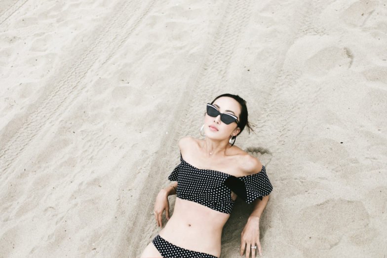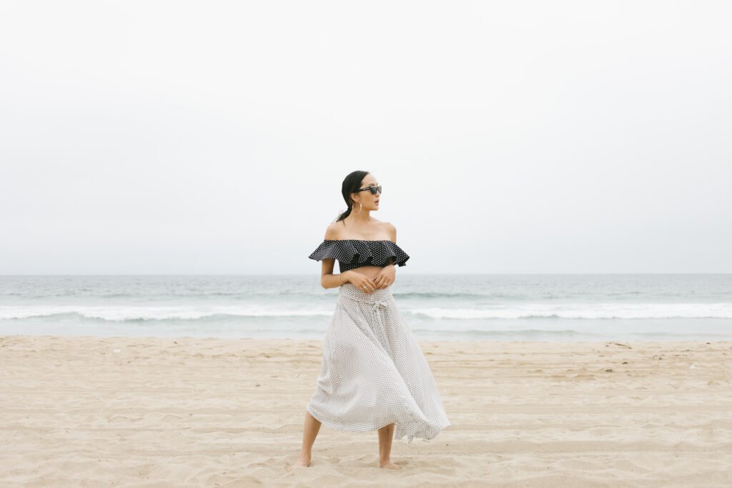 For my first ensemble, I embraced a playful twist on a classic pattern. Imagine a gorgeous polka dot bikini that doubles as a sophisticated swimsuit cover-up when paired with a high-waisted skirt. I discovered this stunning Lisa Marie suit that instantly caught my eye with its charming print and innovative design. The bikini top, with its ruffled detailing, transforms effortlessly into a crop top once tucked into a chic skirt—perfect for covering up when the sun’s too strong or when you’re heading out for a bite to eat.