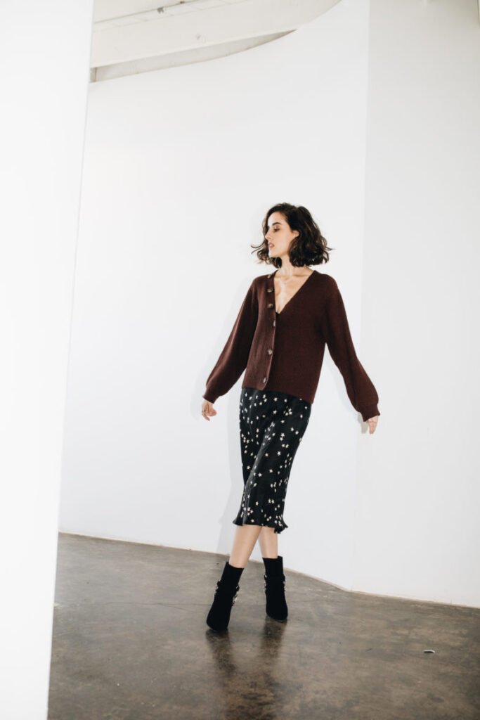 Instead of the once-popular turtleneck-under-slip-dress trend, this year, embrace the oversized cardigan or chunky sweater worn over the dress. Buttoning up a soft knit over a silky slip dress transforms it into a completely new ensemble, adding warmth while maintaining a stylish contrast between textures. The key to making this look feel intentional is to play with proportions—opt for a slightly cropped sweater or cinch the waist with a belt to maintain structure. Finish off the look with heeled boots to bring a touch of fall sophistication.