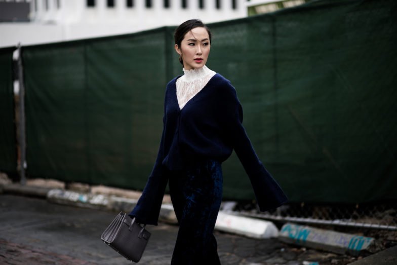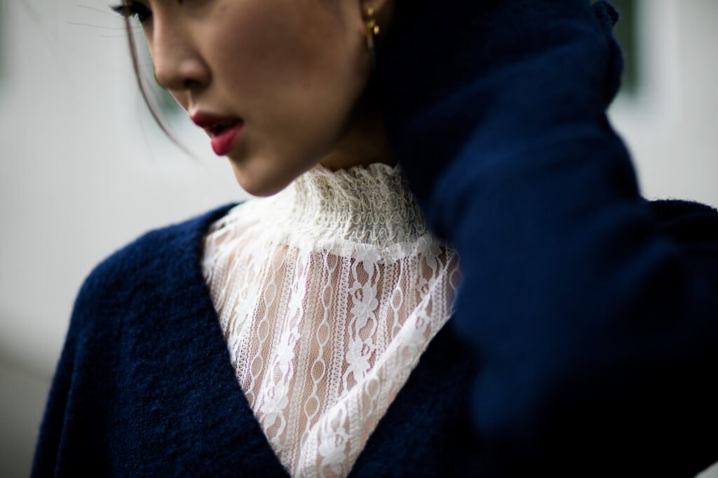 The foundation of my look started with a stunning navy blue knit sweater featuring exaggerated sleeves—effortlessly combining comfort with a touch of drama. To elevate the look, I paired it with luxurious navy blue velvet trousers, which added depth and richness to the outfit. The subtle peek of lace underneath brought a delicate, romantic contrast that balanced out the structured elements perfectly.